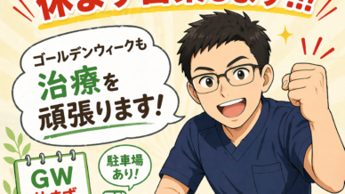 連休中、病院や他の治療院がお休みでお困りではありませんか?休みの時こそ気が緩み、身体に痛みや不調が出るんですよね...当院ではゴールデンウィーク期間中も通常通り営業し、急な痛みや不調にしっかり対応いた...